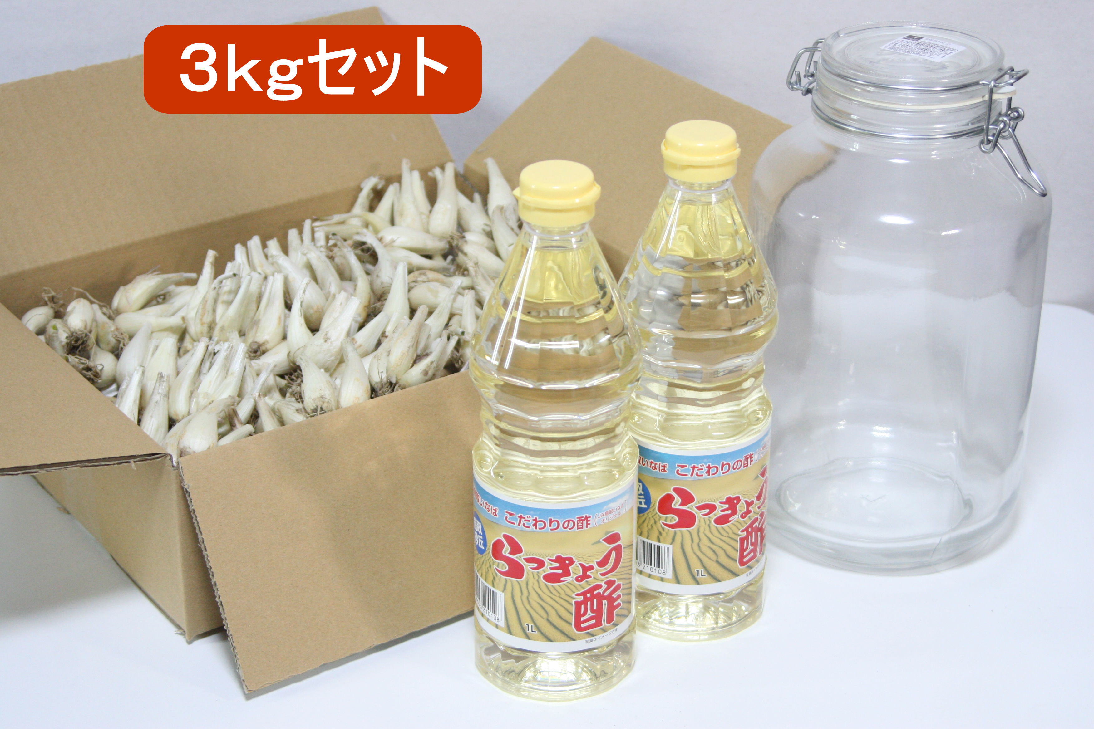 生らっきょう、ビン、らっきょう酢、漬け方説明書を1つのセットにしました。